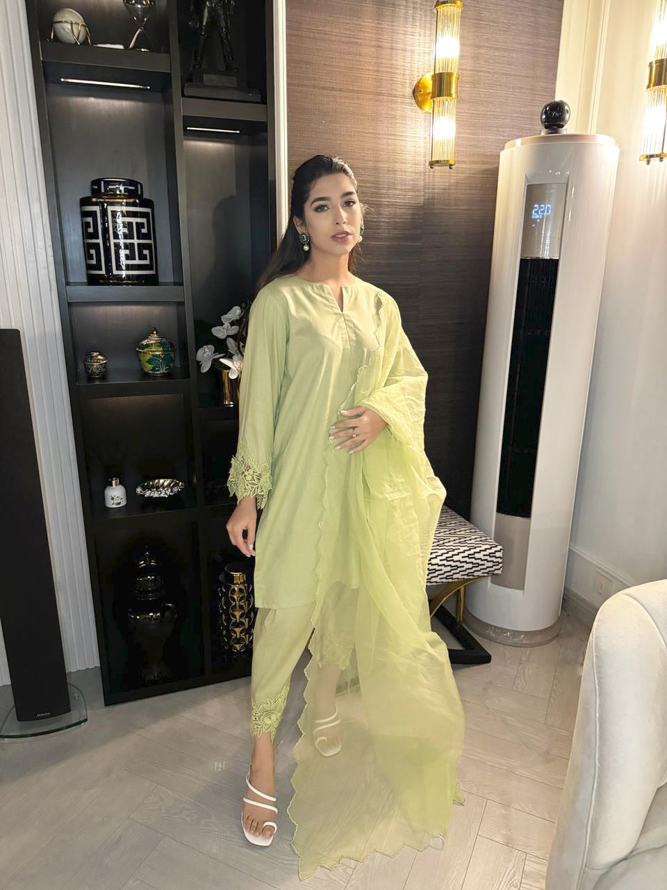 Completing the look is a dupatta crafted from fine organza, featuring scalloped edges on all four sides, adding a touch of graceful charm.