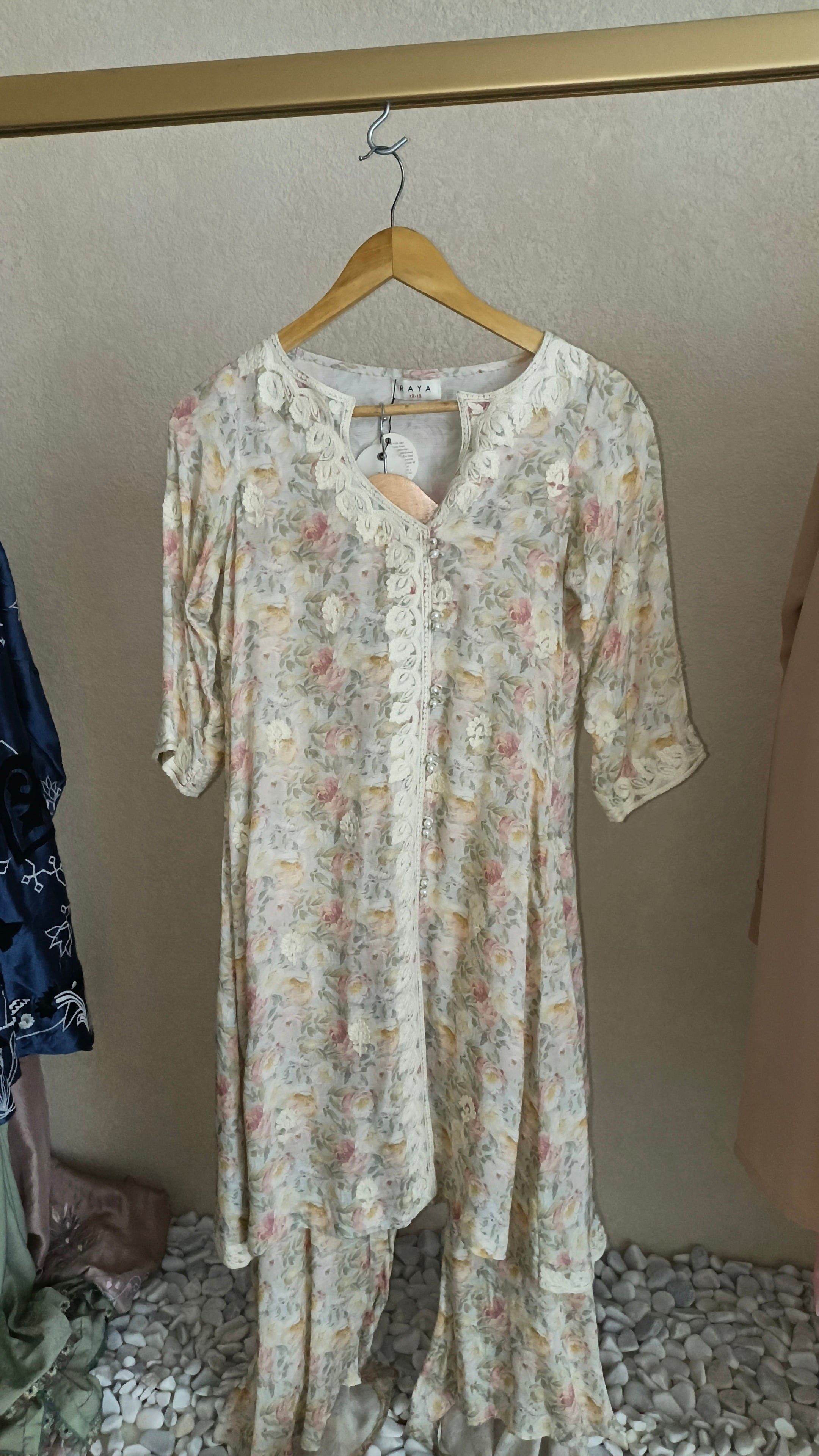 Bloom is where tradition meets modern elegance. This floral set features a tunic-style top with a scalloped neckline, delicate lace detailing, and three-quarter sleeves finished with lace trim. Paired with wide-legged pants in the same soft floral print, it creates a graceful silhouette that’s perfect for festive gatherings or semi-formal occasions. With its muted tones and intricate details, Bloom embodies Raya’s signature touch — timeless, feminine, and effortlessly stylish.