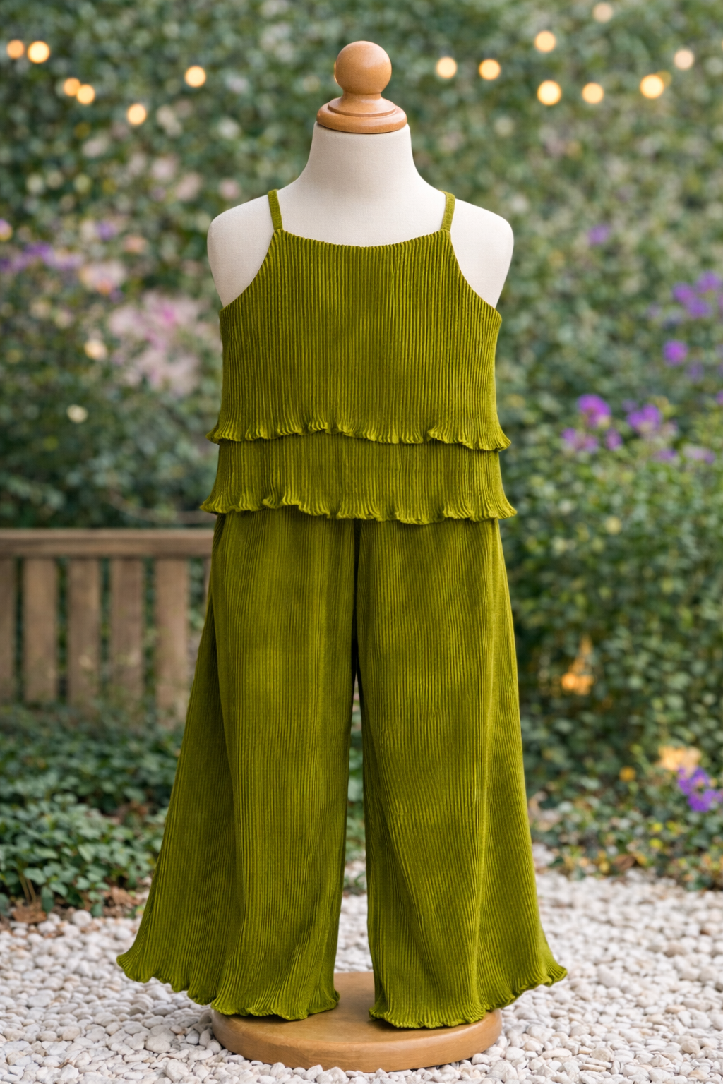 A charming pleated outfit designed with both style and comfort in mind. This two-piece set includes a sleeveless top with delicate straps and a playful ruffled hem, paired with wide-legged pants finished with matching ruffles. Crafted from soft, velvety pleated fabric, Fleur is gentle on the skin and easy to wear, making it perfect for active little ones.