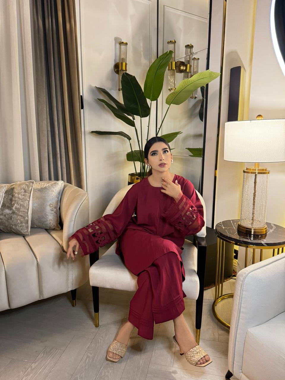 Featuring a pleated neckline and creatively manipulated sleeves, this co-ord set exudes style and sophistication. The culottes, adorned with pleats at the bottom, complete the ensemble with contemporary flair.